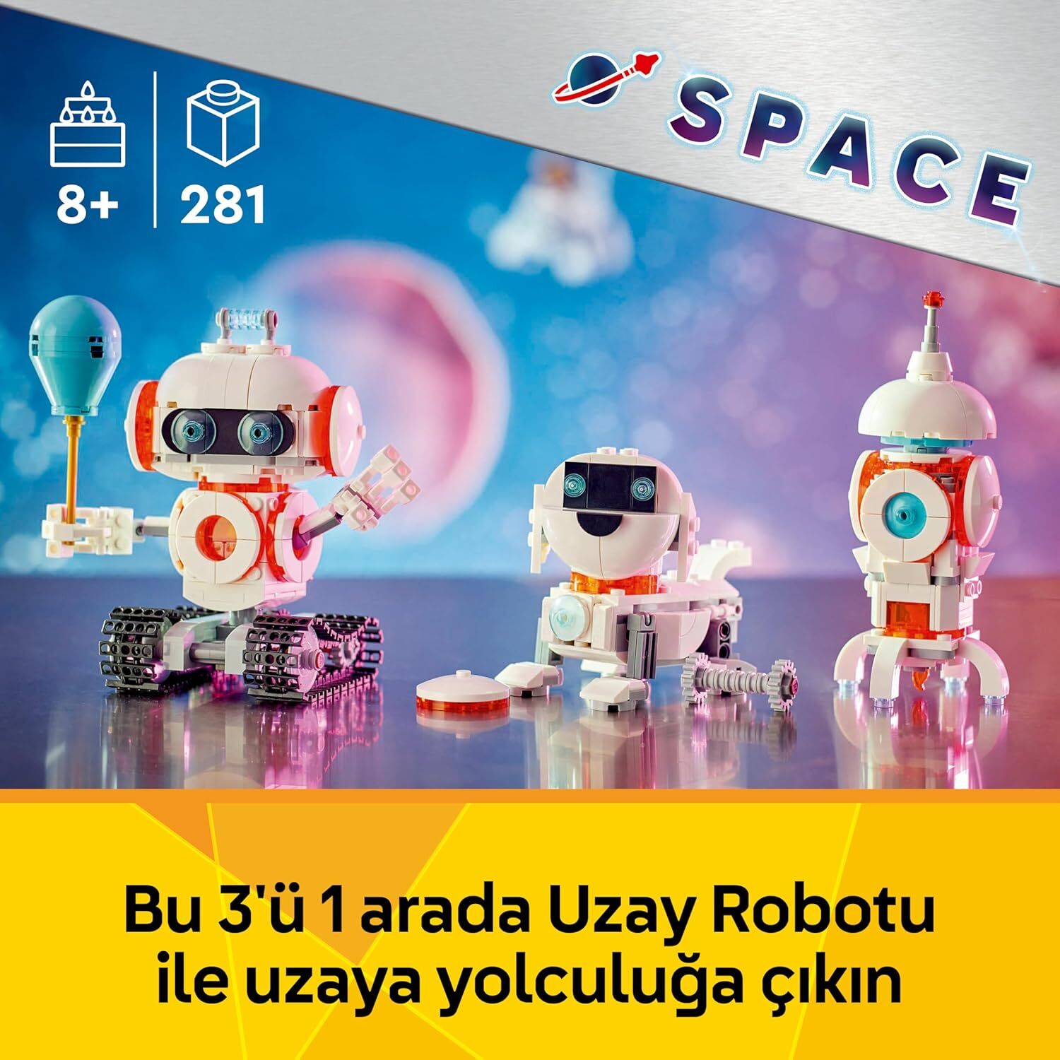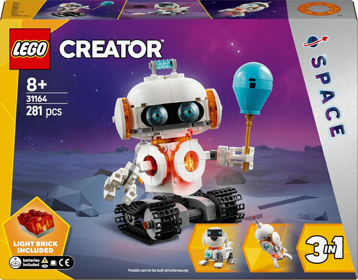 LEGO Creator 3’ü 1 Arada Uzay Robotu 31164 ile macera dolu bir galaksi yolculuğuna hazır olun! 8 yaş ve üzeri çocuklar için tasarlanan bu 281 parçalık set, tek kutuda üç farklı oyuncak inşa etme imkanı sunar. LEGO Creator 3’ü 1 Arada Uzay Robotu 31164 modelini isterseniz hareketli eklemlere sahip güçlü bir robota, isterseniz sevimli bir uzay köpeğine veya hızlı bir rokete dönüştürebilirsiniz.