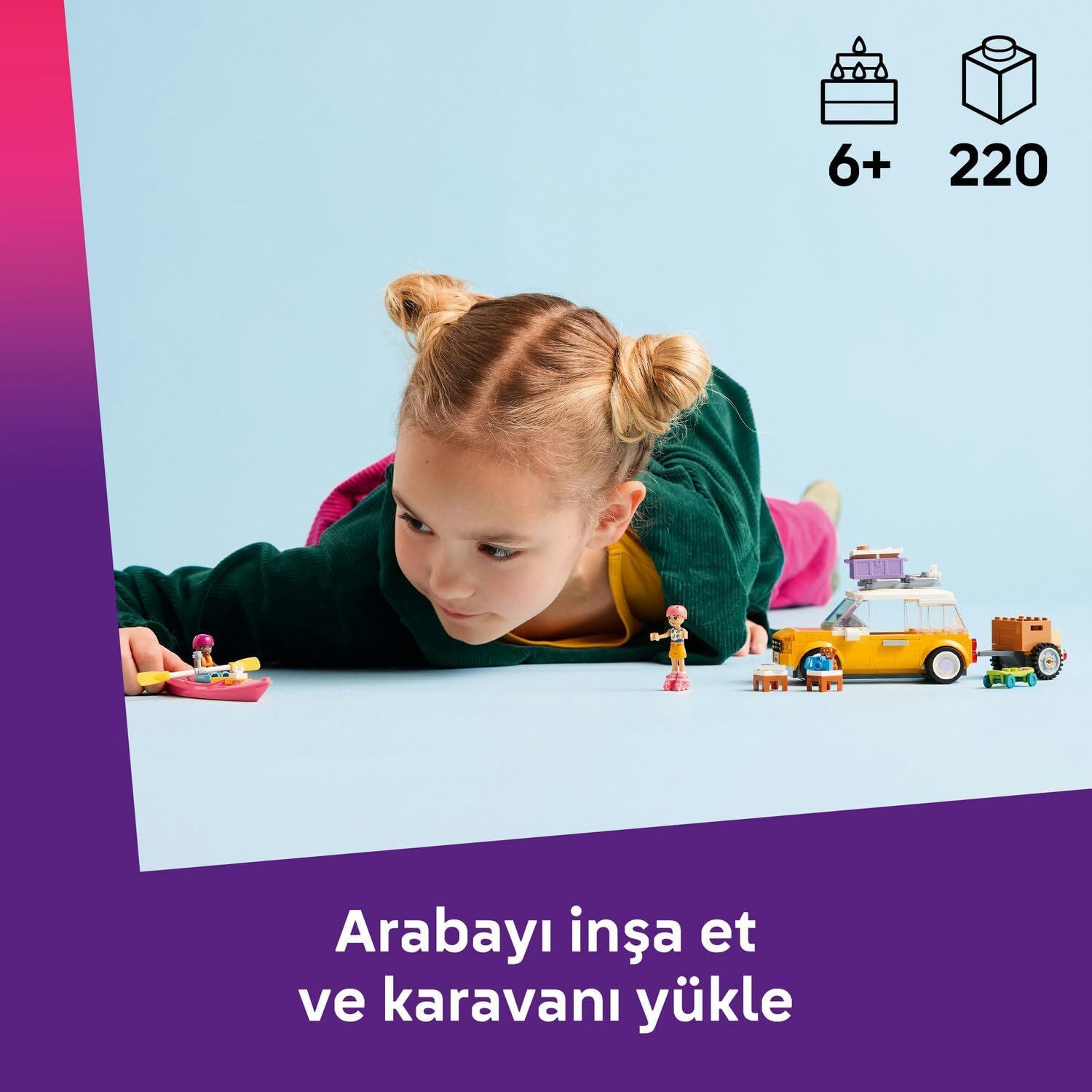 - İnşa edilebilen römorklu LEGO aracı – Oyuncak aracı yaparken eğlendikten sonra, kano ve soğutucu gibi arkadaşların maceralı yolculuklarında ihtiyaç duyacakları her şeyi arabaya yükleyin
